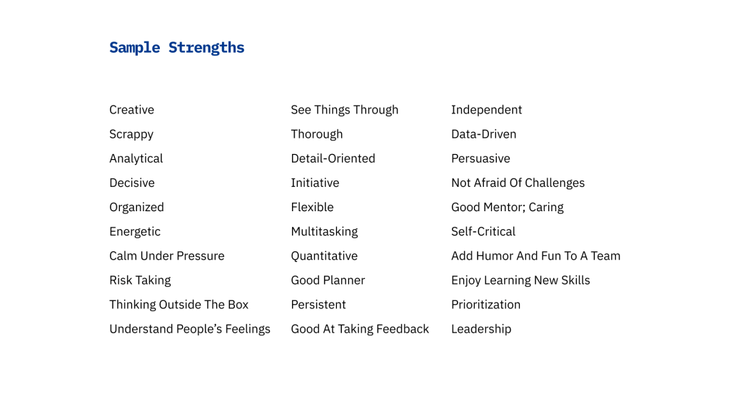 Ở bảng dưới là ví dụ một số điểm mạnh của một Product Manager, hãy tìm cách highlight những điểm mạnh của bạn trong quá trình phòng vấn.
