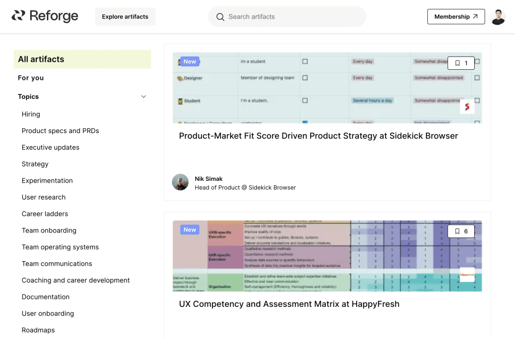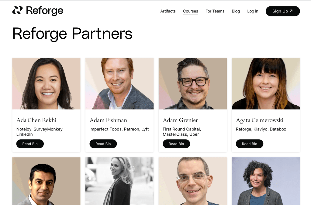 Quay trở lại Reforge, là nơi có lợi thế là có đội ngũ giảng viên từ các công ty công nghệ lớn trên thế giới như Hubspot, Dropbox, Lift, Uber, Netflix, v.v.. và các thành viên cũng chất lượng đến từ các công ty công nghệ, khởi nghiệp toàn thế giới. Tận dụng lợi thế này, gần đây Reforge cho ra đời chuyên trang gọi là Artifacts, tại đây các đội ngũ giảng viên, học viên của họ chia sẻ các tài liệu thực tế trong quá trình làm việc của mình như Product Roadmap, Go-to-market Strategy, Strategy, Pitch Deck, v.v..