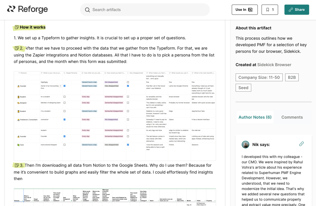 Chi tiết một tài liệu chia sẻ về Product Market Fit Score Driven Product Strategy và lý do tại sao có tài liệu này từ tác giả Nik Simak khi làm việc ở SideKick Browser, đi kèm các chú giải của tác giả. Ảnh: Hoàng Tùng